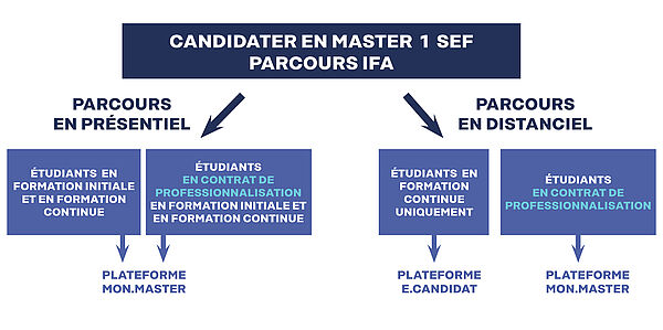 Pour intégrer le Master 1 SEF parcours IFA, vous devez candidater sur une plateforme spécifique selon votre profil et/ou le régime d'étude envisagé